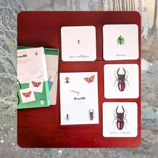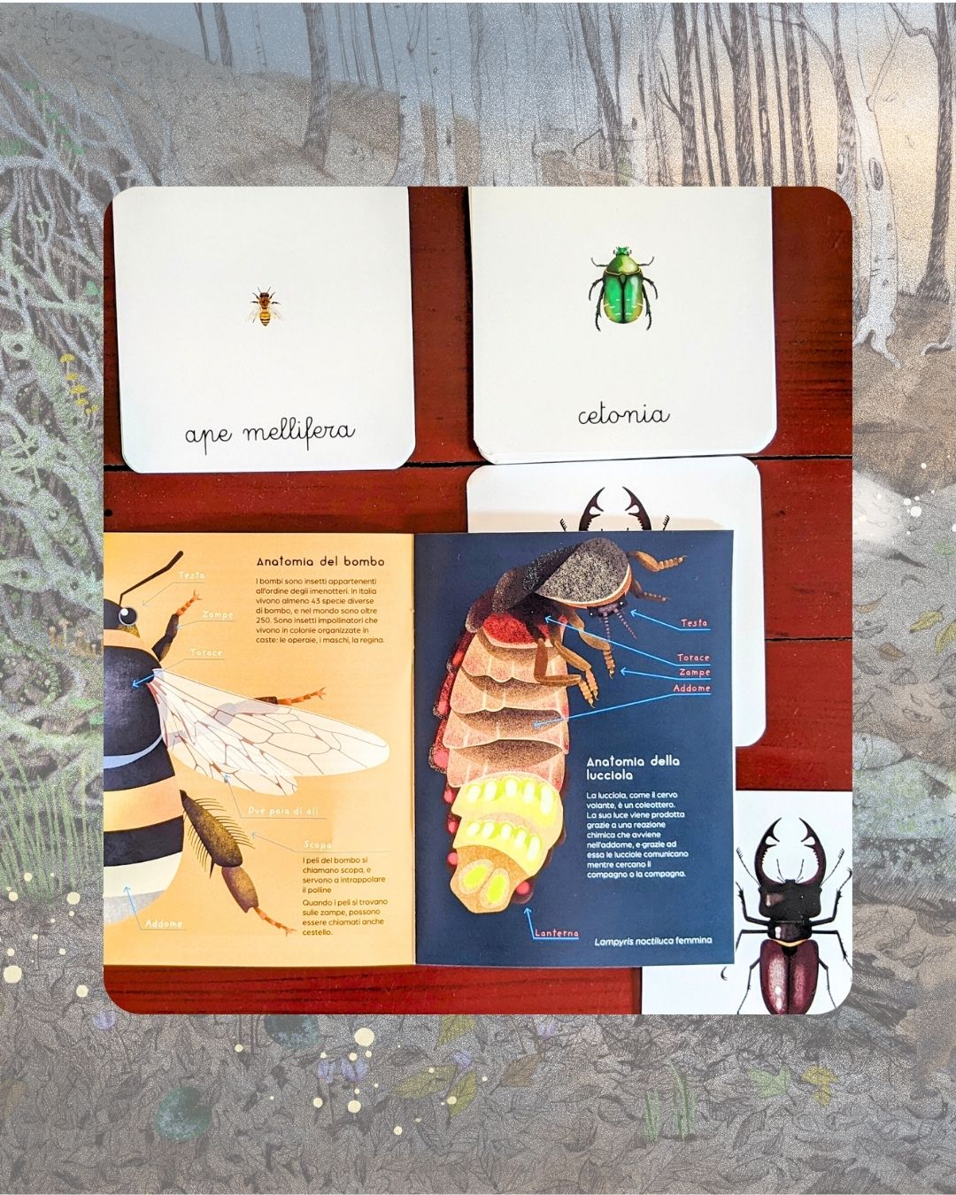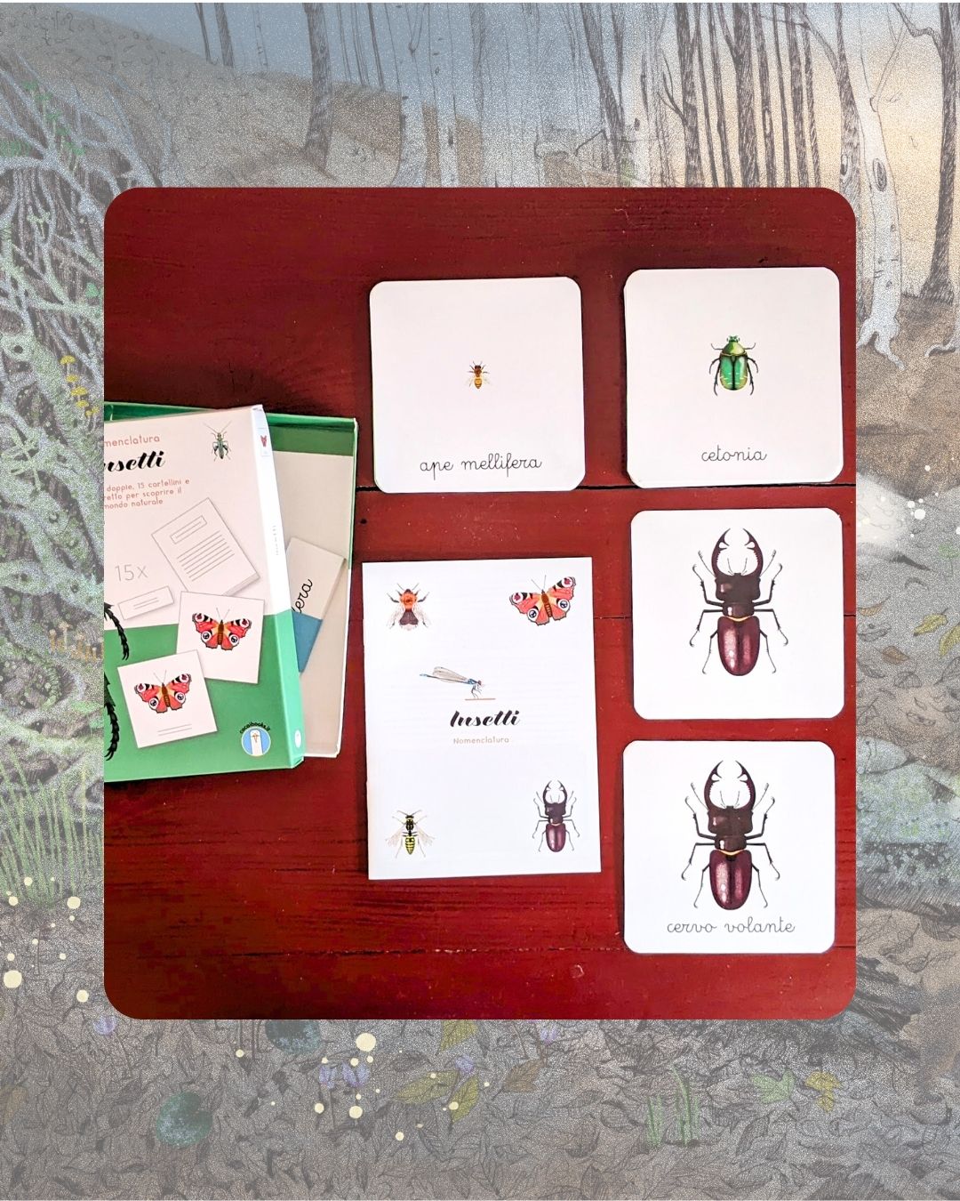 Questa nomenclatura classificata di ispirazione Montessoriana è dedicata agli insetti che possiamo incontrare comunemente nei giardini e nei boschi d'Italia ed Europa. Nella confezione troverete: 15 carte "parlate" con l'immagine del soggetto e il suo nome 15 carte "mute", con la sola immagine 15 cartellini con i nomi Novità: un libretto contenente un'introduzione, tre anatomie di insetti (bombo, lucciola, cervo volante) e informazioni su ogni specie presentata nella nomenclatura Lo trovi qui https://cocaidesign.it/shop/prodotto/nomenclatura-insetti